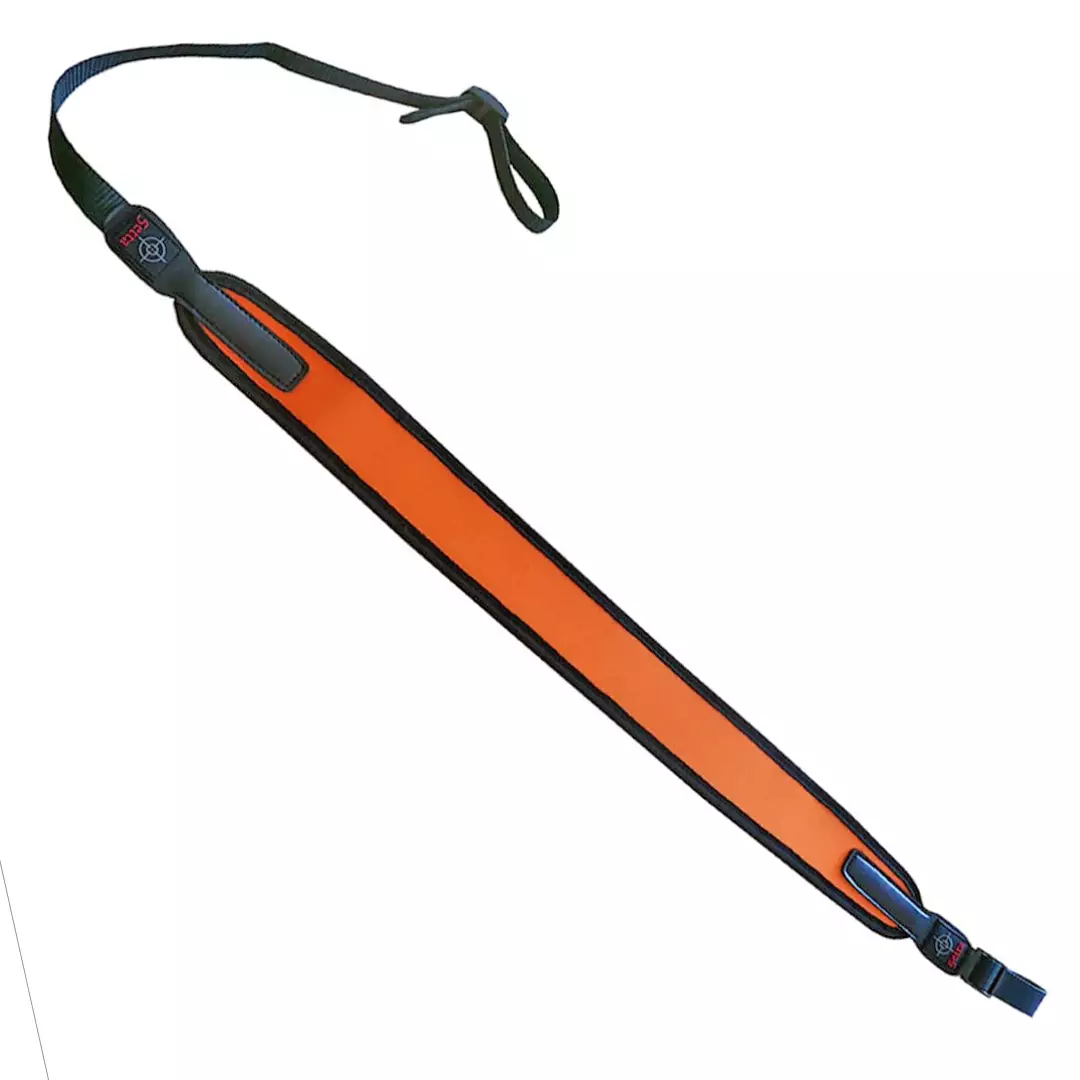 Asehihna oranssia neopreeniä - mukava ja hieman joustava hihna. Hihnan taustapuoli on kumipäällystetty, mikä estää sen liukumisen olkapäältä.
