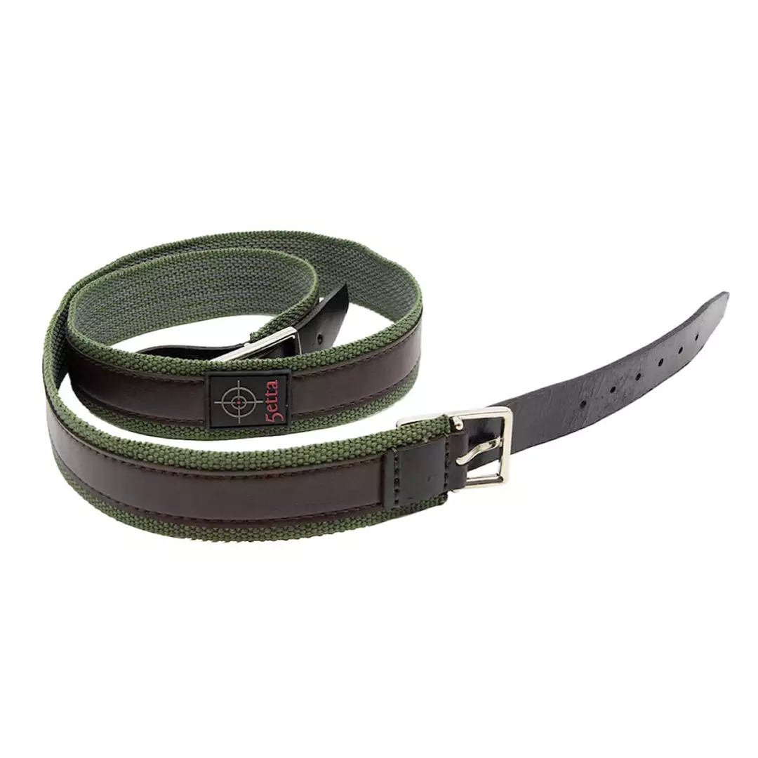 5ettan tyylikäs asehihna. Valmistettu vahvasta, vihreästä polyesterinauhasta, johon on ommeltu ruskea keinonahka. Hihnan taustapuoli on kumipäällystetty, mikä estää hihnan liukumisen olkapäältä.