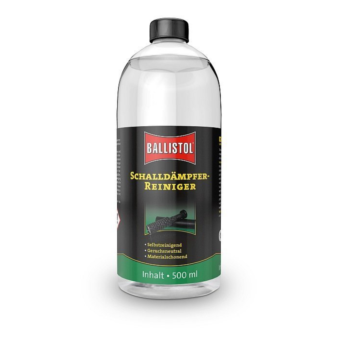 Ballistol äänenvaimentimen puhdistusaine 500 ml 23381-FI jolla puhdistat karstaiset äänenvaimnentajat helposti. Aine kaadetaan vaimentajaana ja annetaan vaikuttaa noin 2 tuntia. Mukana tulee kaksi erikokoista tulppaa joilla voi tulpata vaimentajan.