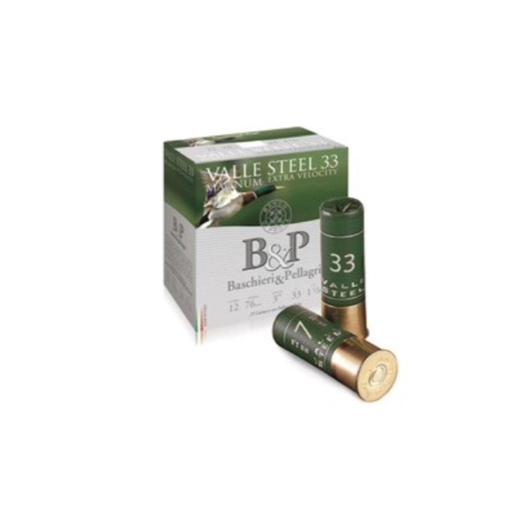 B&P Valle Steel 33g Magnum Extra Velocity 12/76 25kpl 450 m/s on erittäin korkean suorituskyvyn omaava patruuna Italiasta. Patruunan lähtönopeus on 450m/s. Patruunaa saa ampua ainoastaan teräshaulihyväksytyillä haulikoilla.