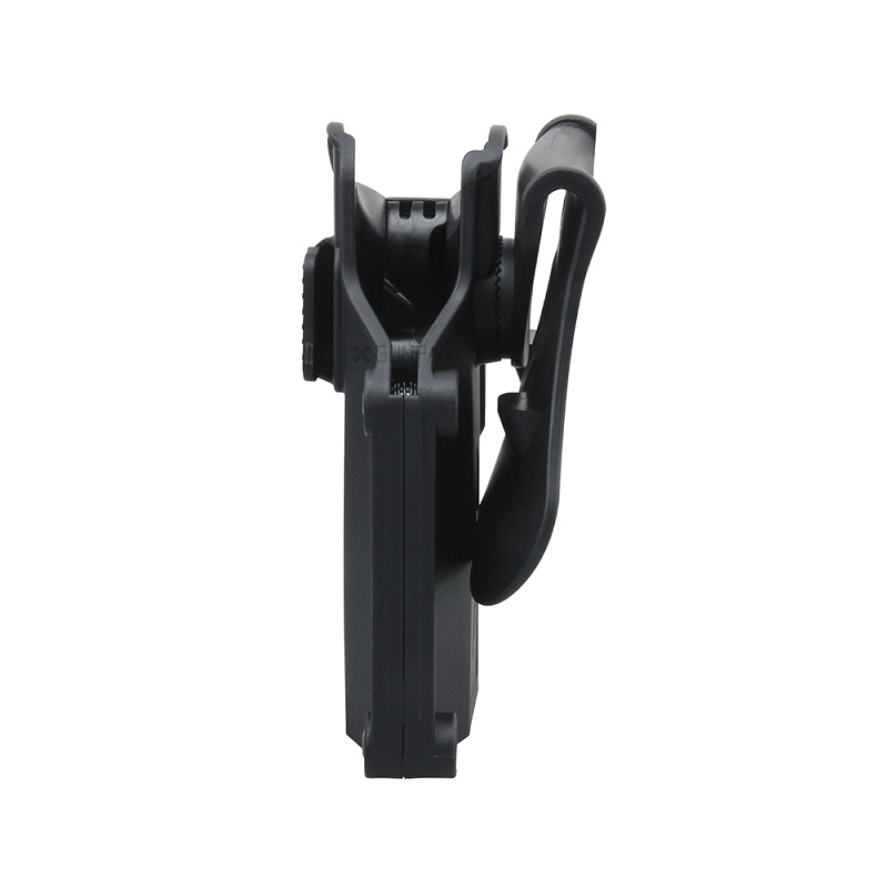 Valmistettu muovipolymeeristä, oikeanpuolen kätisyys, sopii useimpiin pistooleihin, automaattinen lukitus. Suunniteltu vaativaan käyttöön, mattamusta.