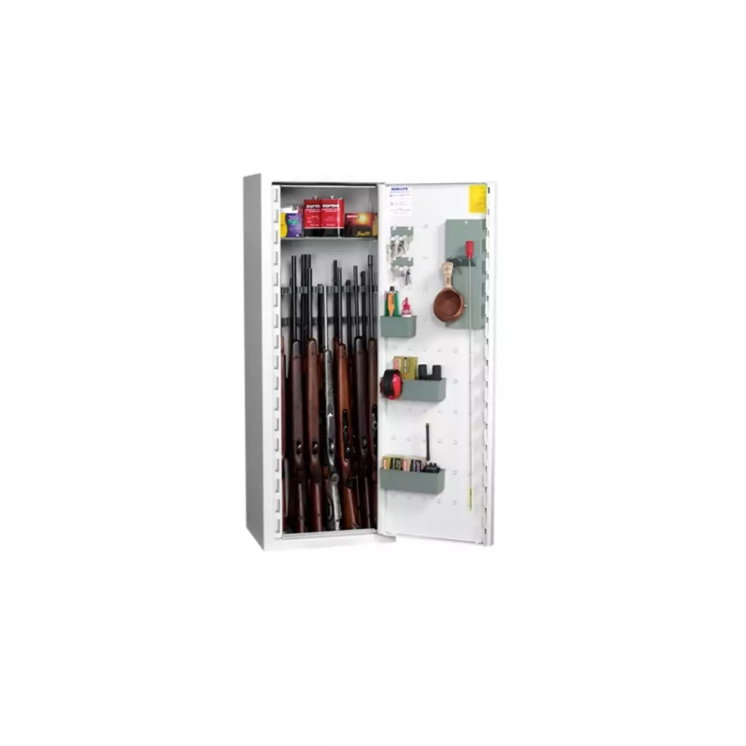 Reilunkokoinen kaappi, johon mahtuu laajakin asekokoelma. Sisustus 16 aseelle. Siirrettävä ylähylly voidaan korvata lisävarusteena saatavalla lukittavalla lokerolla. Ovessa 3 siirrettävää tarvikelokeroa ja puhdistuspuikkojen pidin. Toimitus ei sisällä kuvassa näkyvää puista kattolevyä.
