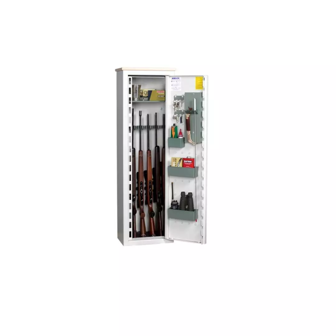 Pienikokoinen ja helposti sijoitettava asekaappi tiloihin, jotka asettavat rajoituksia kaapin koolle. Sisustus 7 aseelle. Kaapissa on ylähylly ja ovessa 3 siirrettävää tarvikelokeroa ja puhdistuspuikkojen pidin. Toimitus ei sisällä kuvassa näkyvää puista kattolevyä.