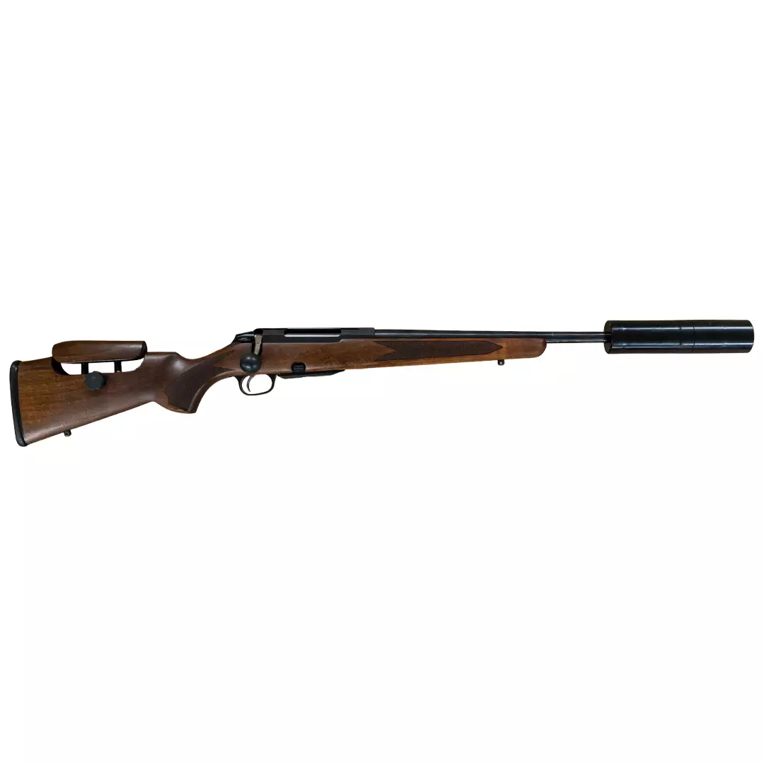 Hienossa kunnossa oleva hirviase lyhennetyllä piipulla ja säädettävällä poskipakalla. Mukana myös vaimennin!