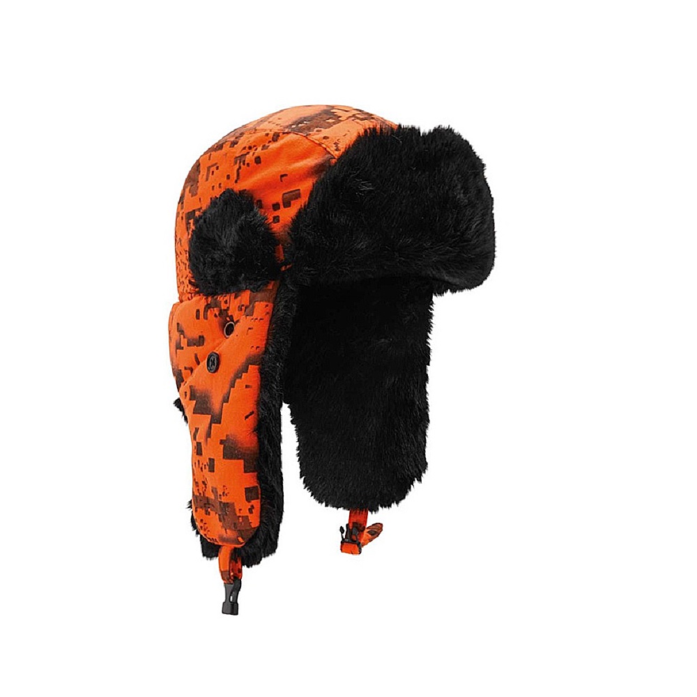 Oranssilla Desolve Fire -digicamo kuviolla varustettu lämmin karvahattu kaikkeen jahtiin! Todella miellyttävä ja lämmin jahtihattu kylmiin keleihin!