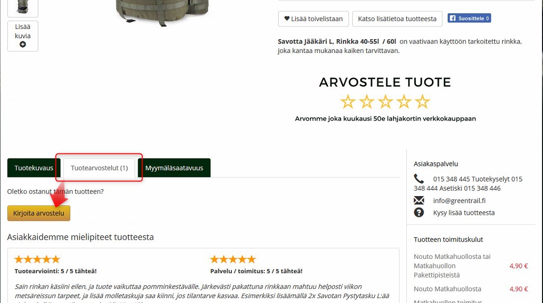 2. Tuotteen kuvauksen vieressä näet kohdan "Tuotearvostelut", klikkaa sitä ja sen jälkeen kohdasta "Kirjoita tuotearvostelu".