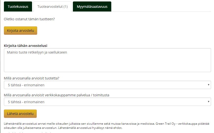Tuotearvostelu-kohta löytyy jokaisen tuotteen alta, muista jättää oikeat yhteystietosi arvostelun yhteyteen!