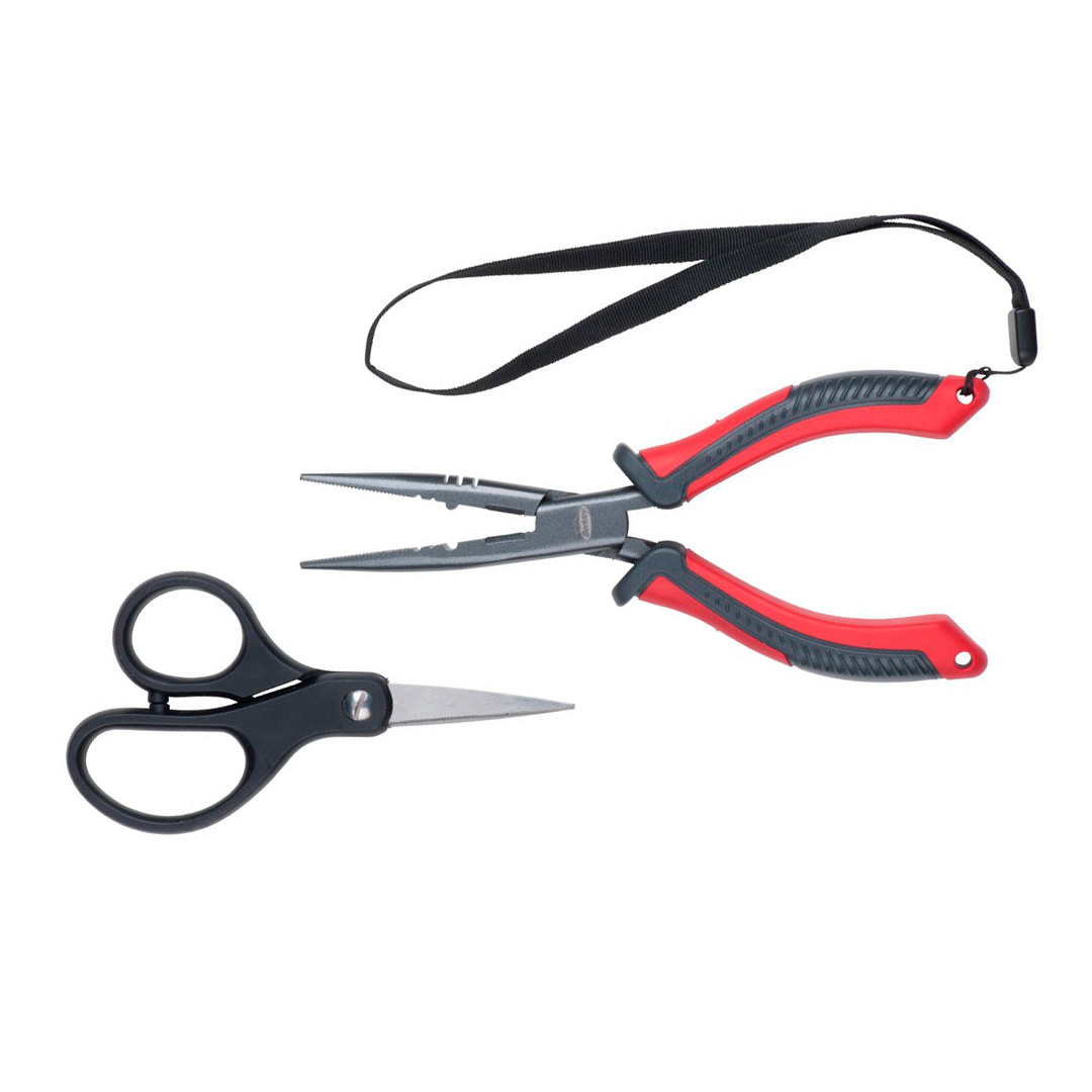 Paketissa hyvät ja jämäkät nokkapihdit, sekä sakset jotka tehoavat hyvin myös kuitusiimaan. Edullinen ja tarpeellinen paketti jokaiselle kalastajalle.