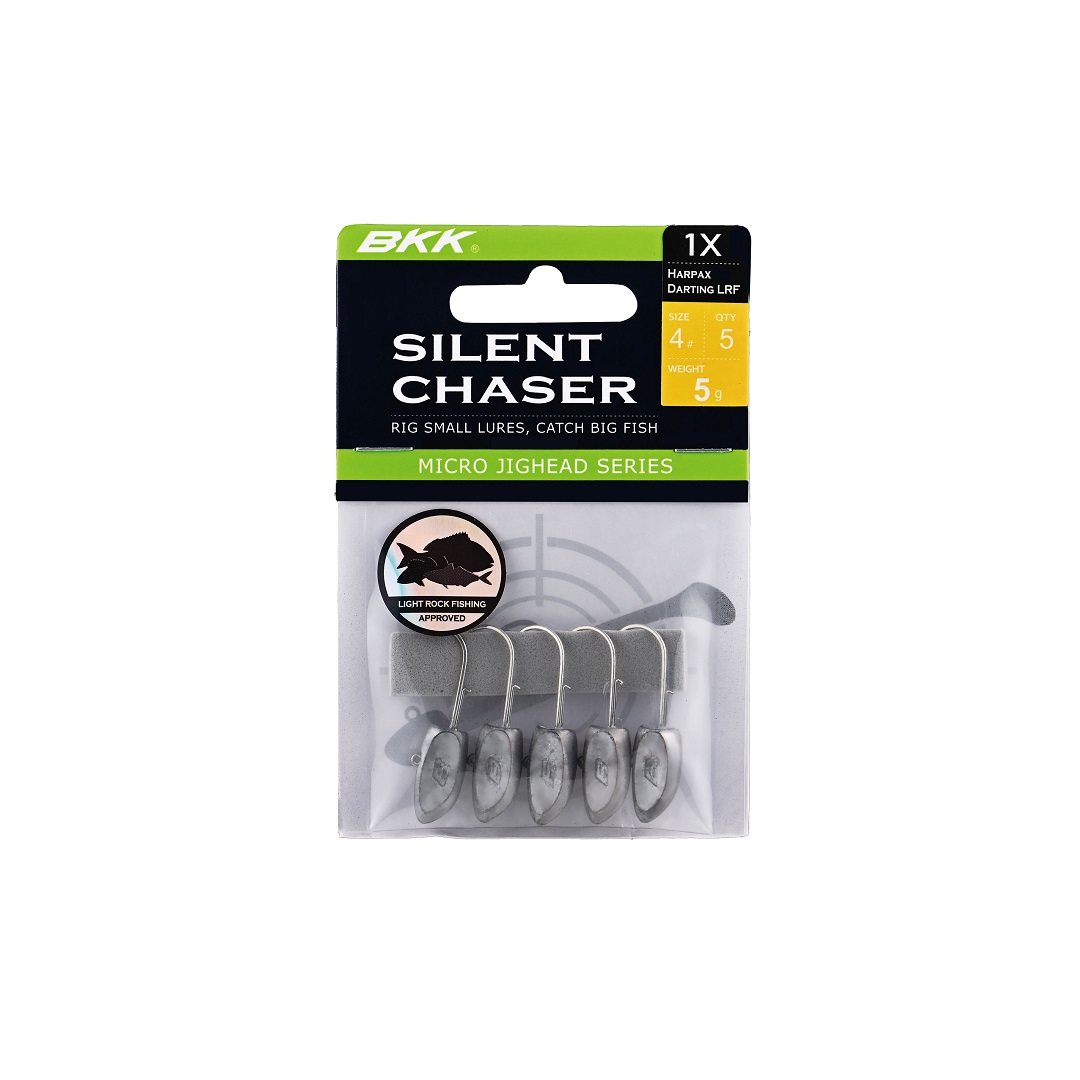 BKK Silent Chaser sarjan microjigipäät on tehty pienille jigeille ja isoille kaloille! Sarjassa on kolme jigipäätä, jotka kaikki antavat erilaisen ja ainutlaatuisen uinnin jigeille: Harpax Darting LRF, Prisma Darting LRF ja Punch LRF. Kaikki kolme mallia on varustettu pienellä väkäsellä, joka pitää jigit hyvin paikallaan, rikkomatta niitä. BT pinnoite suojaa koukkua ruostumiselta ja antaa myös hieman lisävälkettä jigatessa. BT pinnoitteen ansiosta Silent Chaser sarjan jigipäät sopivat erinomaisesti käytettäväksi myös merivedessä. Harpax Darting LRF antaa hienon, sivulta sivulle, liikkeen nykäytyksissä. Vapaassa pudotuksessa jigi taas uppoaa hieman pyörien, aivan kuin kuoleva pikkukala. Paikallaan pidettäessä Harpax Darting LRF pitää jigit täysin vaakatasossa. Toimii perinteisessä jigikalastuksessa kelauitolla. Vavalla "jerkaten" jigeille saa todella hienon poukkoilevan uinnin. Sopii myös vertikaali- / pilkkikalastukseen.