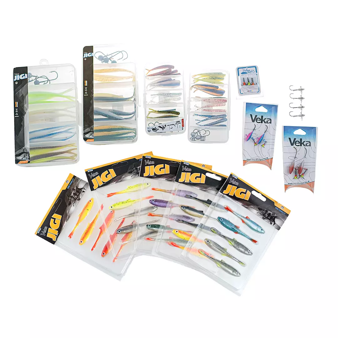 Paketin keskiössä on laaja valikoima VEKA V-Shad -vertikaalijigejä 8 cm koossa. Mukana on viisi eri väriyhdistelmää, jotka kattavat kaiken luonnollisista sävyistä ärsykeväreihin. Lisäksi setti sisältää neljä valmista VEKA Vertical -jigisarjaa kahdessa eri koossa (55 mm ja 100 mm), jotka tarjoavat yhteensä kymmeniä vaihtopyrstöjä ja useita valmiita jigipäitä.