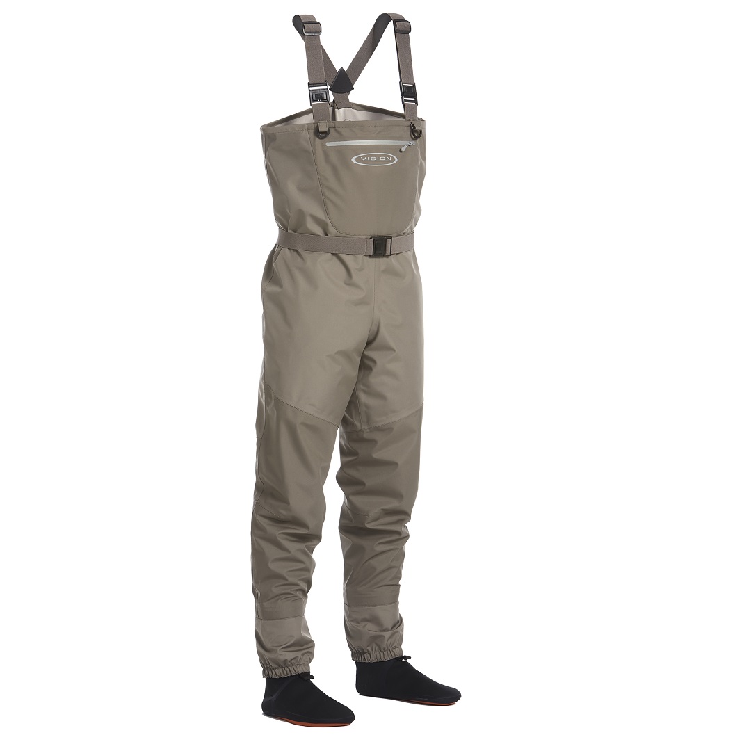 Tämä on Vision edullisin kahluuhousu, mutta se on valmistettu silti laadukkaista materiaaleista uhraamatta tärkeistä yksityiskohdista. Housut on valmistettu käyttäen 3-kerrosrakennetta ja ne ovat erittäin kevyet. Housuissa on sisäpuolella yläosassa arvotavaratasku, sekä housun ulkopuolella isompi tasku, johon saa vaikkapa perhorasiat. Housuissa on säädettävän henkselit, jotka ovat erittäin miellyttävät, sekä vyö jolla housu istuvat hyvin ja varmistat ettei vesi pääse lahkeisiin vahingon sattuessa.
