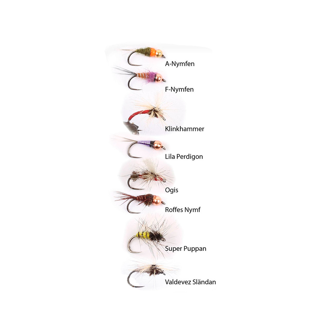 - Perhot: A-Nymfen #14, F-Nymfen #14, Klinkhammer #16, Lila Perdigon #14, Ogis #14, Roffes Nymf #14, Super pupa #14, Valdevez Sländan #16