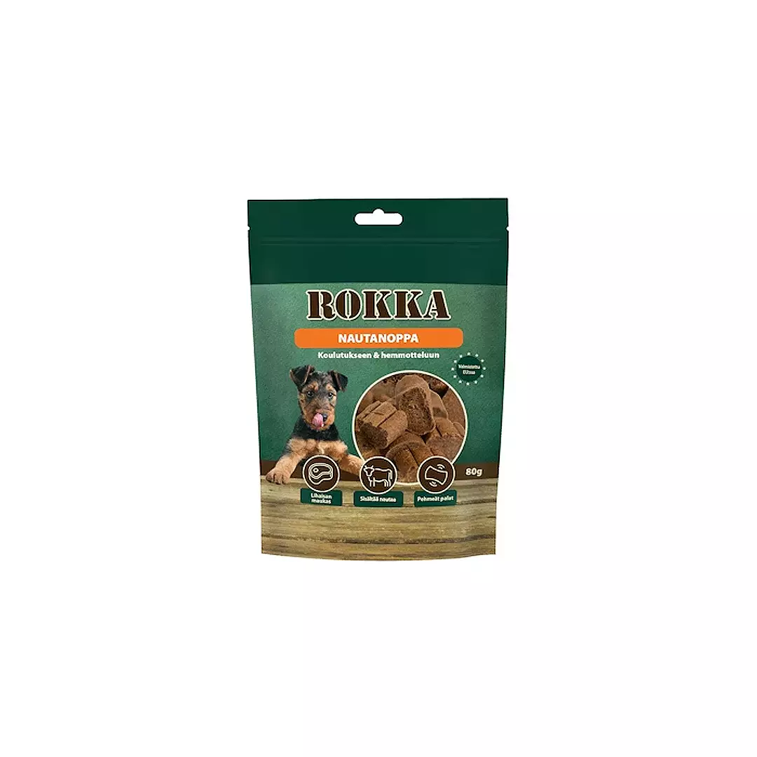 Rokka Nautanoppa on korkealaatuinen ja lihaisa makupala, joka on suunniteltu erityisesti aktiivisen koiran palkitsemiseen. Nopan kuohkea ja mehevä rakenne takaa erinomaisen maistuvuuden, mikä tekee siitä luottovalinnan niin koulutuskentille kuin kotihemmotteluun.