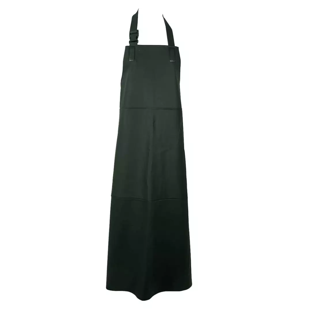 Kestävä esiliina PVC-päällystettyä polyesteria. Edestä vahvistettu ja säädettävä niskanauha sekä kiristysnarut vyötäröllä. Pituus on 125 cm, mutta se on helppo lyhentää 115 cm:iin leikkaamalla helmaan merkittyjen saumojen välistä.