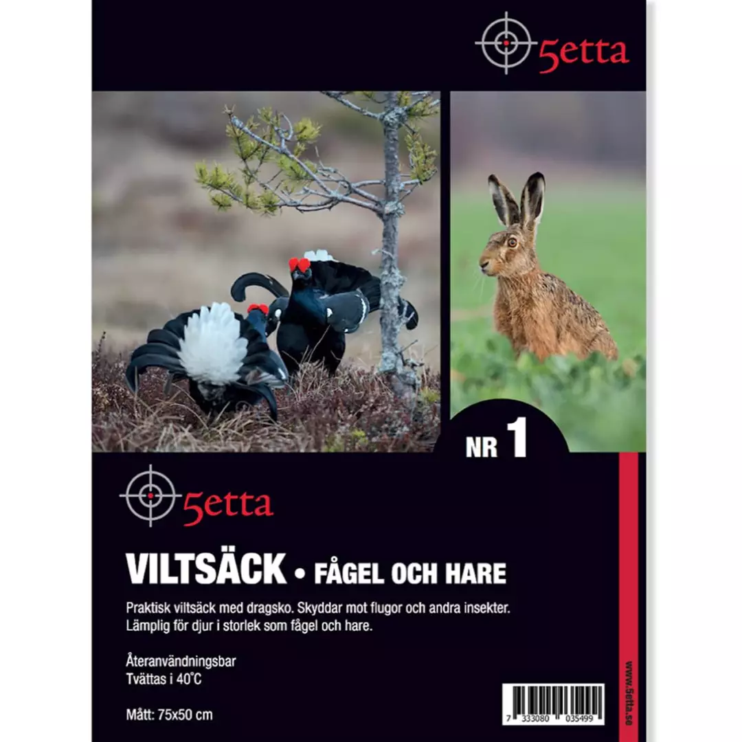 Käytännöllinen riistasäkki vetoketjulla. Suojaa kärpäsiltä ja muilta hyönteisiltä. Soveltuu kokonsa puolesta jäniksille ja riistalinnuille.