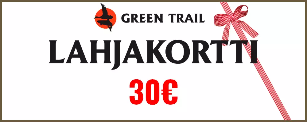 Lahjakortti Verkkokauppaan, Arvo 30€ erinomainen idea vaikka lahjaksi, Green Trailin Verkkokaupan lahjakortti. Tilaamalla tämän tuotteen saat sähköpostiisi koodin, jonka voit käyttää tilausta tehdessäsi syöttämällä koodin kohtaan "kampanja- tai alennuskoodi". Lahjakortit ovat voimassa 6kk ostopäivästä lähtien.
