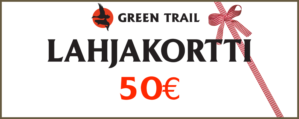 Lahjakortti Verkkokauppaan, Arvo 50€ erinomainen idea vaikka lahjaksi, Green Trailin Verkkokaupan lahjakortti. Tilaamalla tämän tuotteen saat sähköpostiisi koodin, jonka voit käyttää tilausta tehdessäsi syöttämällä koodin kohtaan "kampanja- tai alennuskoodi". Lahjakortit ovat voimassa 6kk ostopäivästä lähtien.