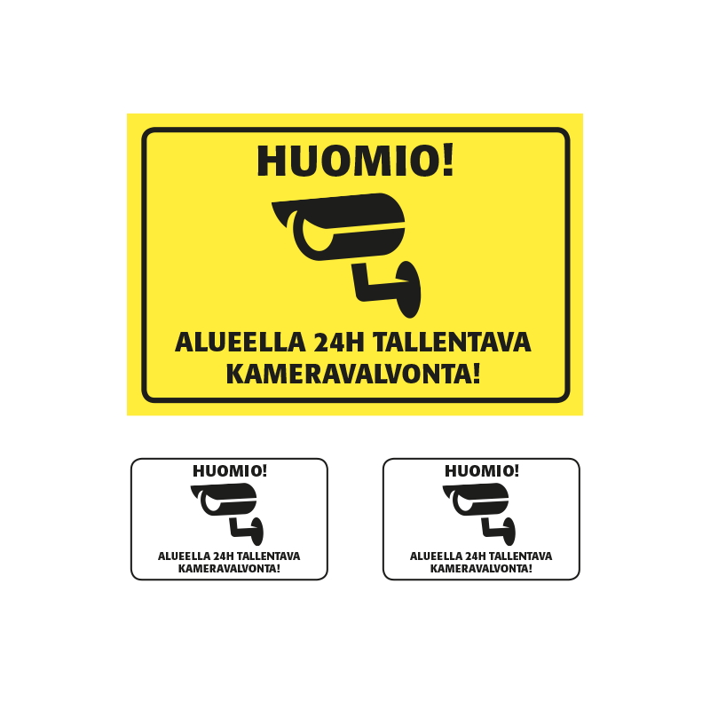 Tallentava kameravalvonta kyltti + tarrat 2kpl paketti sisältää kyltin ja kaksi kappaletta ikkunaan kiinnitettäviä tarroja. Tällä paketilla saat helposti ilmoitettua tallentavasta kameravalvonnasta esim. pihapiirissä. Kyltti on keltainen ja tarrat ovat valkoisia.