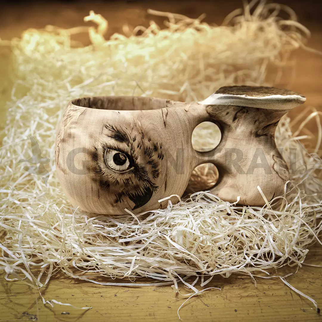Käsintehty kuksa Keski-Suomen Muuramesta on arvostettu ja ainutlaatuinen käyttöesine jokaiselle eräihmiselle. Tämä kuksa on valmistettu suomalaisesta visakoivusta ja vahvasta hirvensarvesta, ja sen kylkeä koristaa käsityönä tehty haukkakaiverrus.