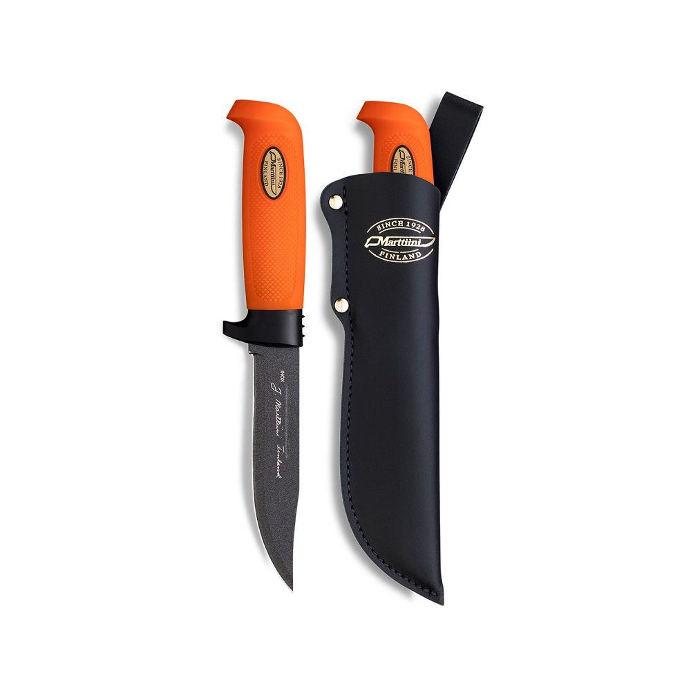 Marttiini Big Game Martef Puukko Nahkatupella nyt näyttävä puukko, nahkatupella. Oranssi kahvainen ei pääse niin helposti häviämään ja komea nahkainen tuppi pitää puukon tukevasti vyöllä.