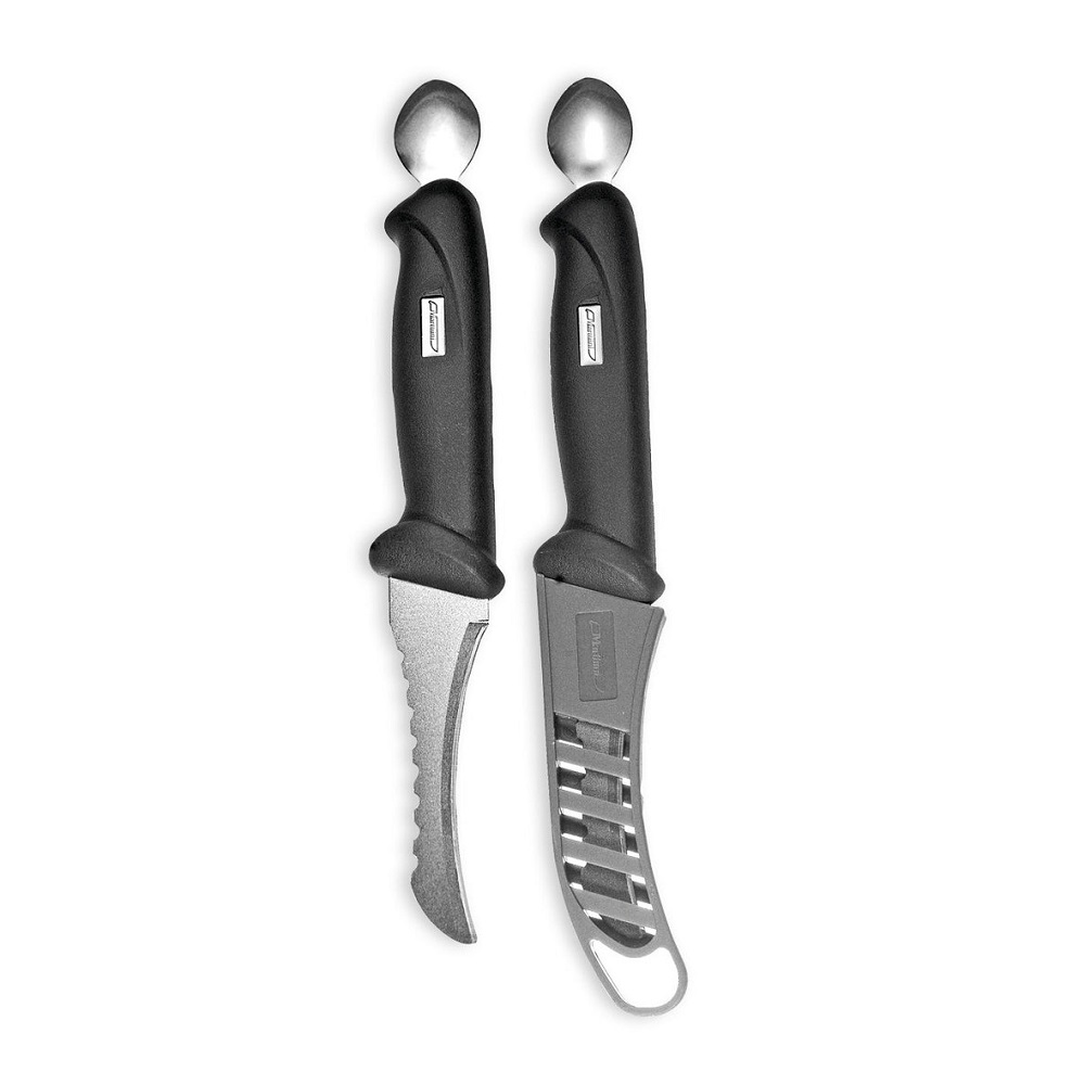 Kalakätevä on nimensä mukaisesti näppärä työkalu kalojen perkaamiseen. Kaarevalla terällä kalan avaaminen on helppoa ja hammastuksella suomustaminen käy kätevästi. Kahvan päässä olevalla metallilusikalla sisälmysten poistaminen on siistiä ja nopeaa.