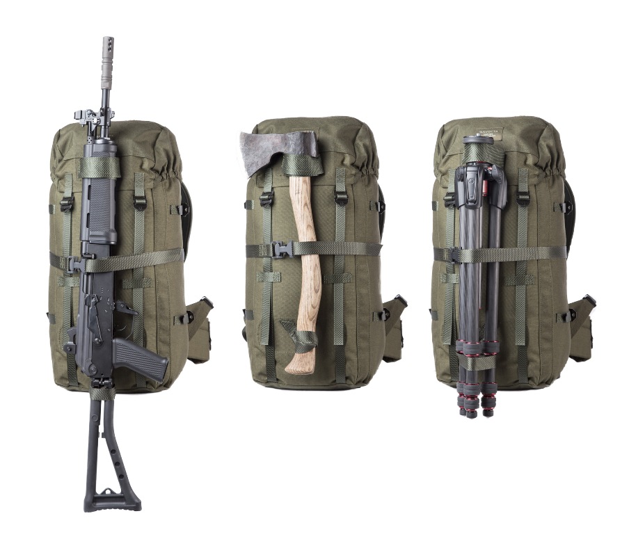 Repun selkäpuolelta läpästä ja pussin alareunasta löytyy kiinnityslenkit kiväärin kantoon. Lenkit sopivat yhtä lailla myös muiden erikoisten pitkien tarvikkeiden kantamiseen. Kuorma varmistetaan koko repun kiertävällä kiristettävällä hihnalla.