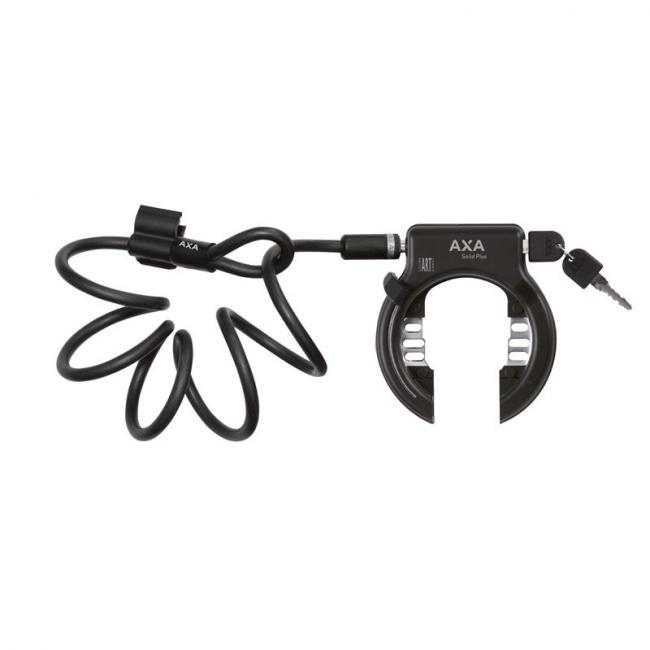 AXA, Solid Plus runkolukko 150 senttisellä AXA Newton vaijerilla. Runkolukon ja vaijerin ansiosta saat pyöräsi lukittua paitsi itse runkolukolla, myös lukkoon kiinnittyvällä vaijerilenkillä, jolla voit kiinnittää pyöräsi telineeseen tai muuhun kiinteään pisteeseen.