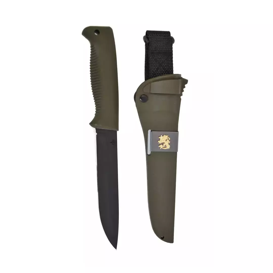 Terä on valmistettu laadukkaasta 80CrV2-hiiliteräksestä, mikä tekee siitä helposti teroitettavan ja pitkäikäisen. Puukon kahvassa on panostettu käyttömukavuuteen – sen ergonominen muotoilu, hyvä pito ja karhennettu tekstuuri takaavat varman otteen myös märissä olosuhteissa.