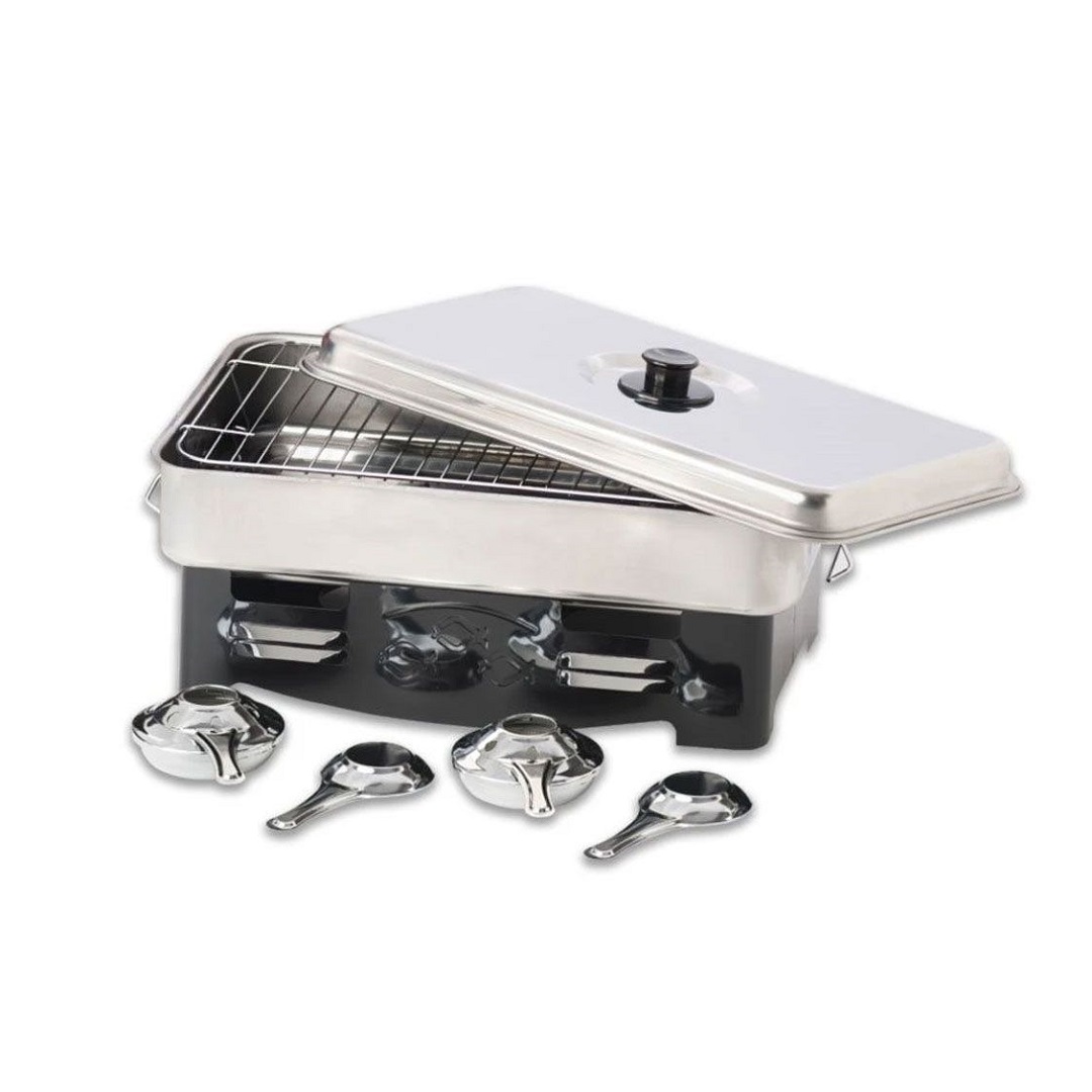 Abu Garcia savustuslaatikko on oiva ja helppo tapa kalan savustukseen. Kahdella ritilällä ja kahdella polttimella oleva savustin kulkee helposti mukana ja mahdollistaa kalan savustamisen ilman näkyvää avotulta.